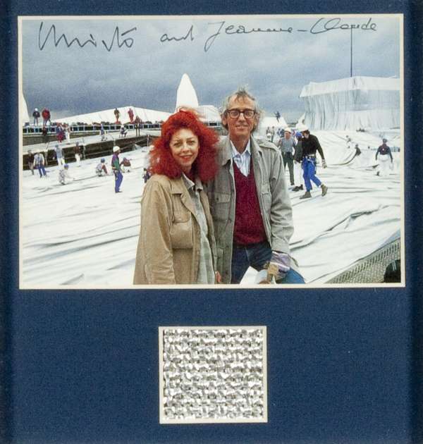 Christo e Jean-Claude Wrapped Reichstag, 1991/1995 postcard e tessuto, cm. 18x17 Firma in alto al centro Foto Wolfgang Volz,Edizioni Schumacher,Dusseldorf