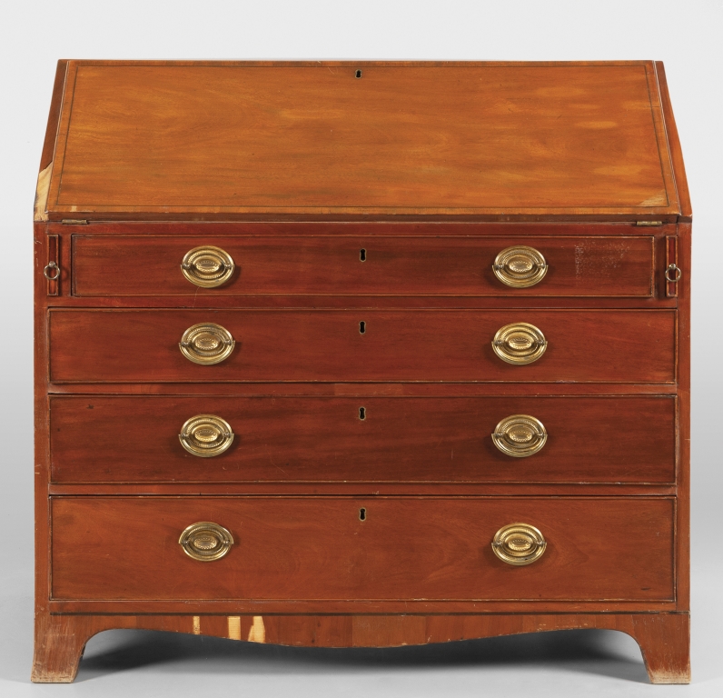 Ribalta lastronata in mogano biondo quattro cassetti sul fronte con calatoia Inghilterra sec.XIX