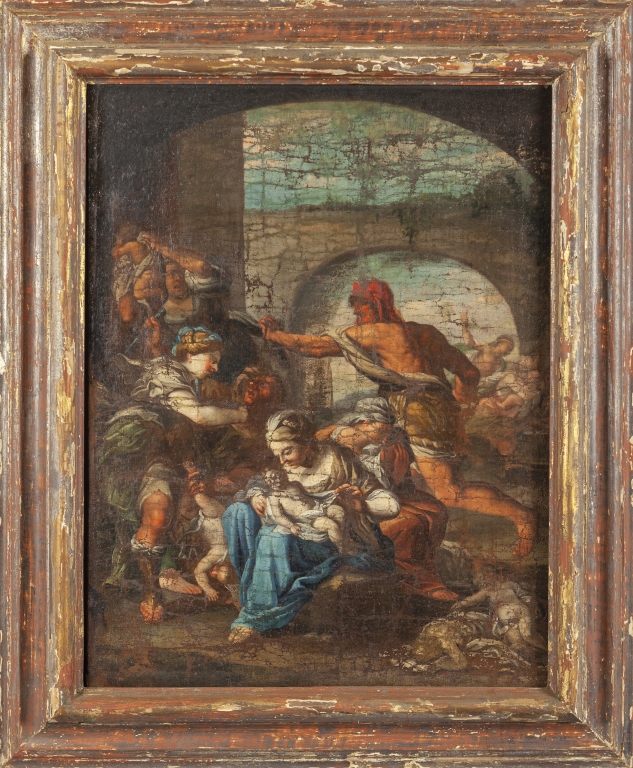 Scuola italiana sec.XVIII 'La strage degli Innocenti' olio cornice in legno intagliato e dorato