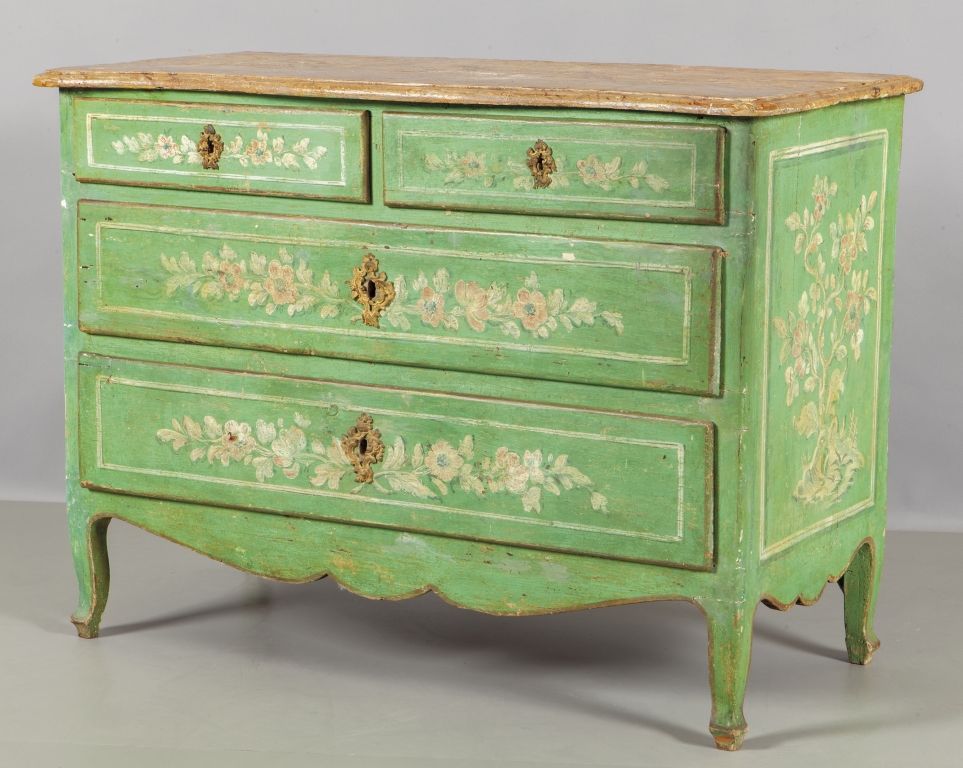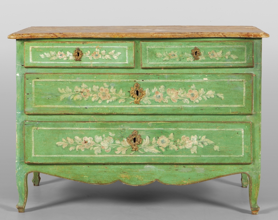 Comò Luigi XIV a due cassetti più due in legno laccato in policromia su fondo verde sec.XVIII