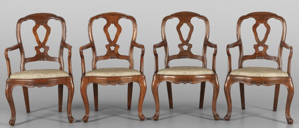 Coppia di poltroncine Luigi XV in noce con schienale a giorno Veneto sec. XVIII ed altre due analoghe in stile