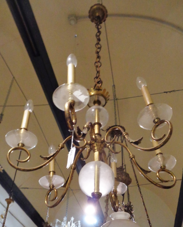 Lampadario in bronzo dorato e opaline a sei luci sec.XX