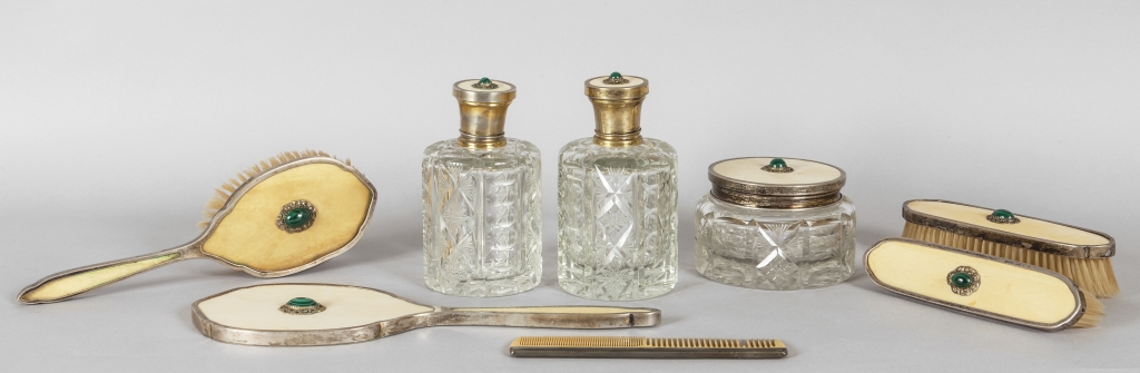Set da toilette in argento avorio cristallo e malachite composto da sette pezzi inizi sec.XX