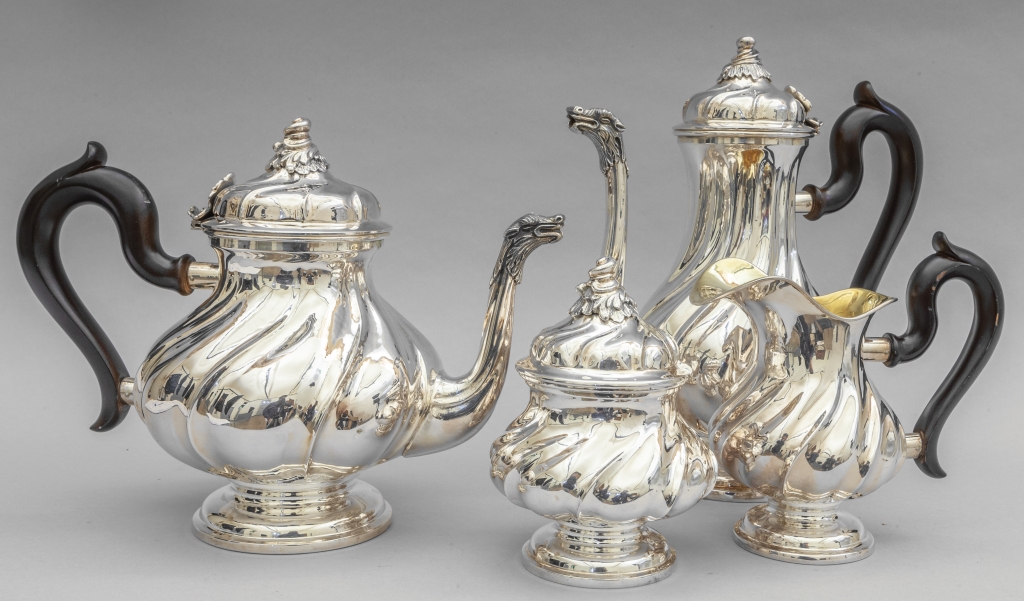 Servizio da the in argento sbalzato in stile barocco manici in legno Codevilla argentiere (quattro pezzi)