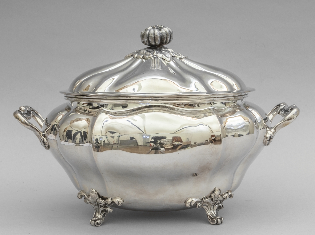 Zuppiera in stile barocco in argento sbalzato presa a pomodoro