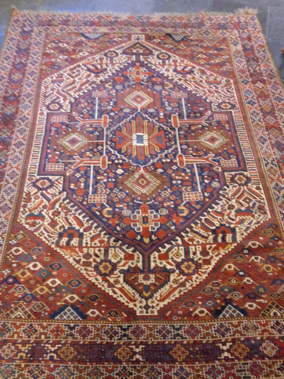 Tappeto persiano fondo blu e rosso decorato con disegni geometrici