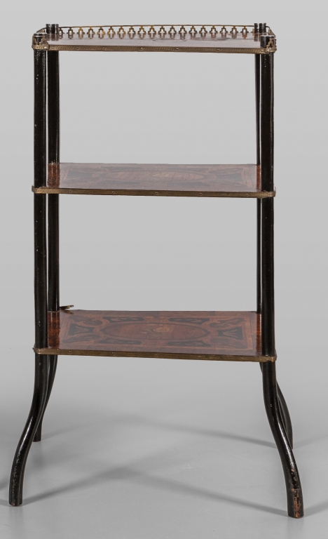 Etagere Napoleone III a tre ripiani lastronata in legni vari Francia sec.XIX
