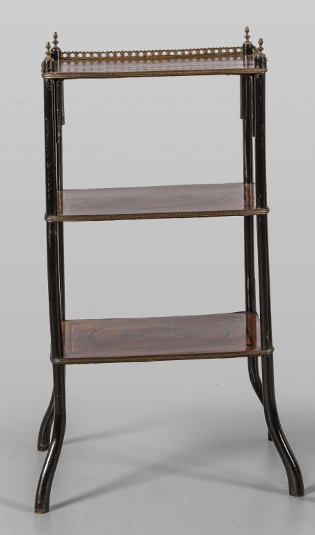 Etagere Napoleone III a tre ripiani più un cassetto lastronato in legni vari Francia sec.XIX