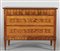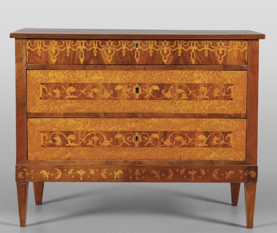 Comò a tre cassetti lastronato ed intagliato in legni vari sec.XIX