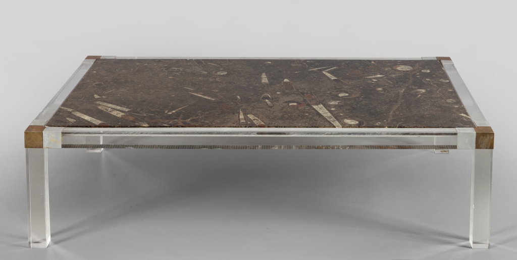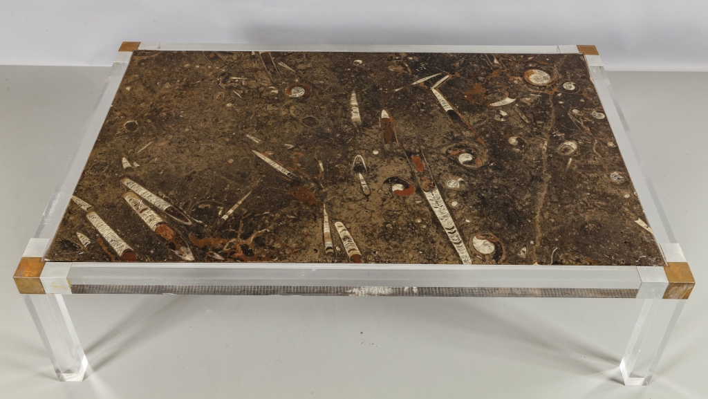 Tavolo da salotto in plexiglass con piano in marmo con inclusioni fossili