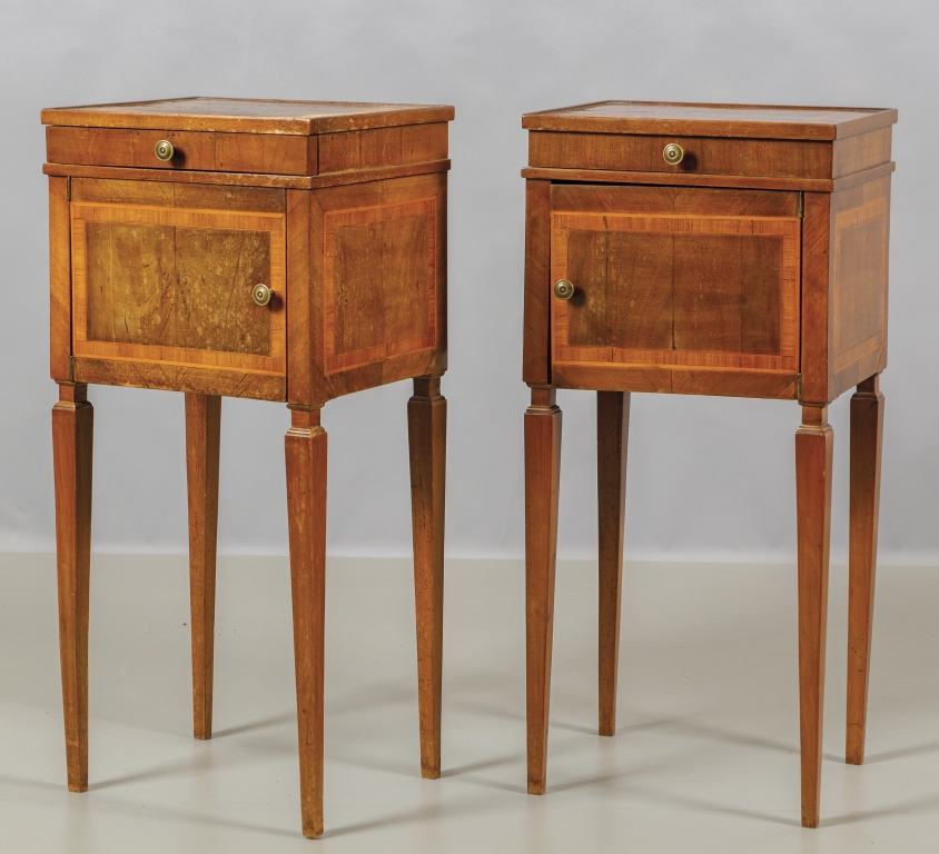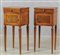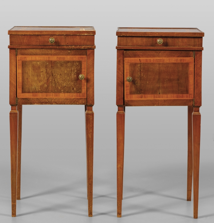 Coppia di comodini in stile Luigi XVI lastronati in noce e filettati in bois de rose sul fronte uno sportello ed un cassetto