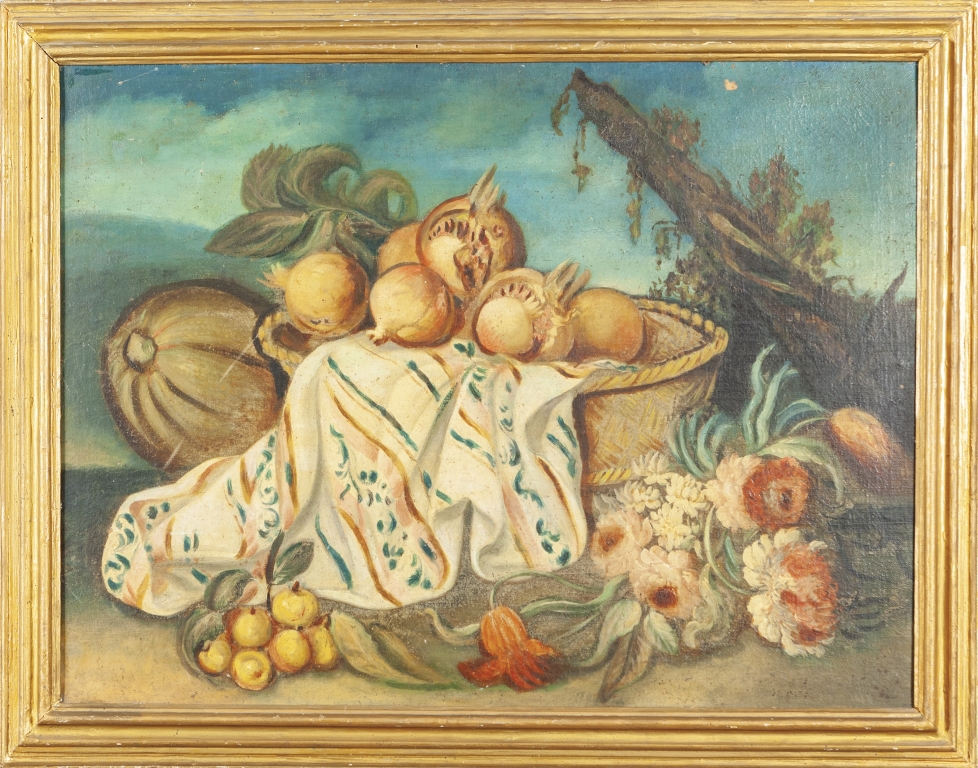 'Natura morta con melograno e fiori' olio fine sec.XVIII