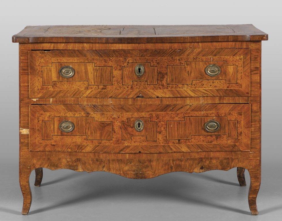 Comò a due cassetti Luigi XVI lastronato in radica di tuja e noce filettato in legno di frutto a motivi geometrici Emilia II metà sec.XVIII
