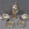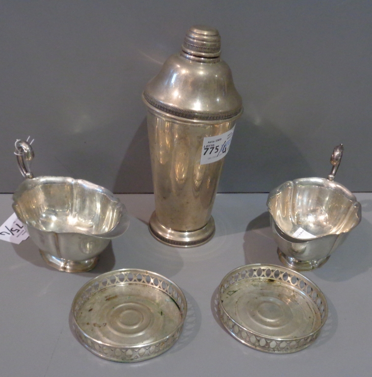 Due sottobottiglie in argento due salsiere ed uno shaker