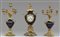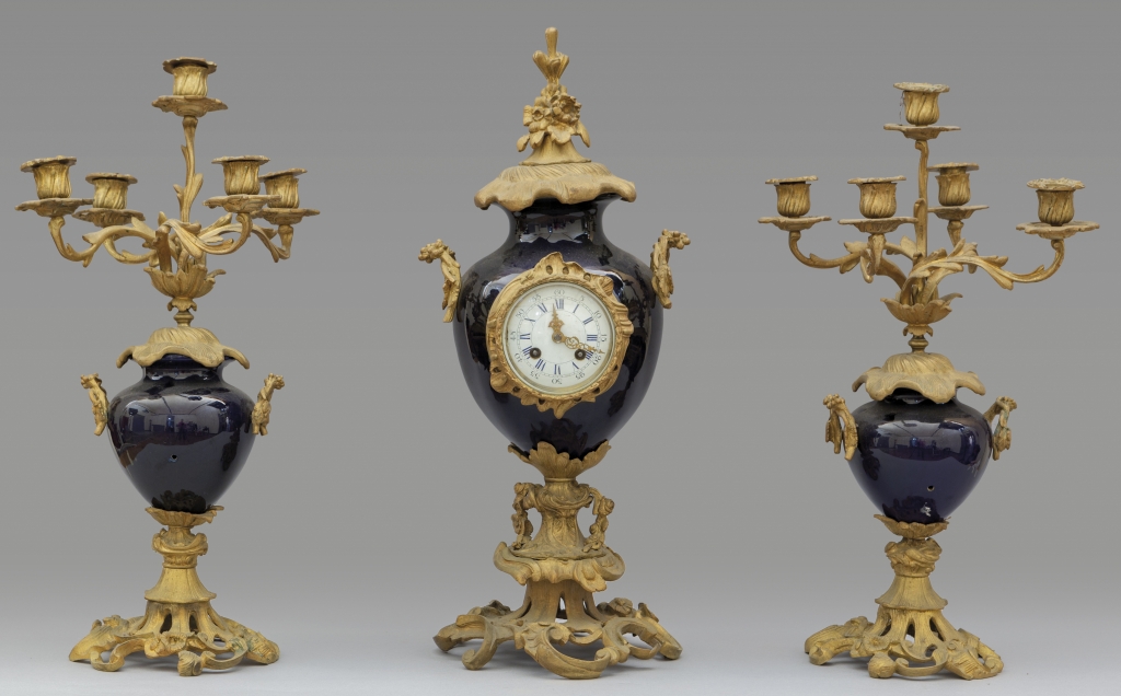 Trittico da camino composto da orologio e coppia di vasi in porcellana e bronzo dorato Francia sec.XIX