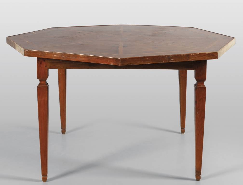 Tavolo da pranzo di forma ottagonale piano lastronato sorretto da quattro gambe trapezoidali in ciliegio Genova inizi sec.XIX