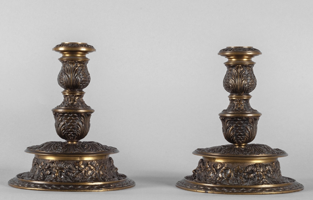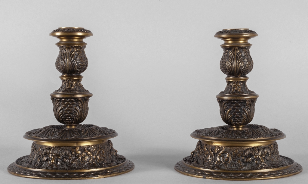 Coppia di candelieri in bronzo brunito su modello Luigi XIII Francia sec.XIX firmati con lettera M