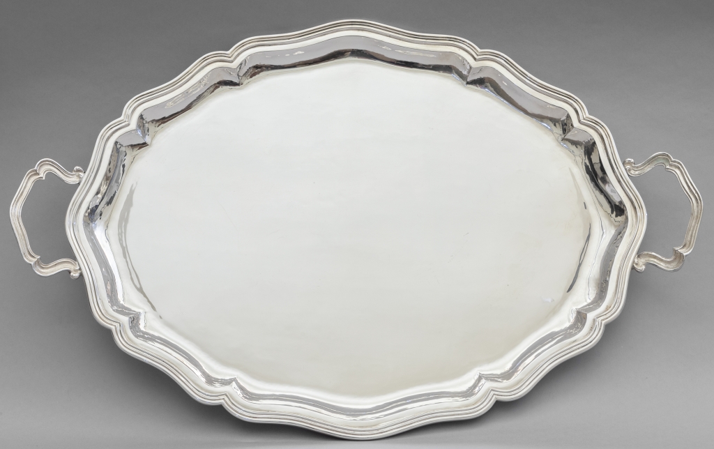 Vassoio ovale con manici in stile barocco in argento sbalzato
