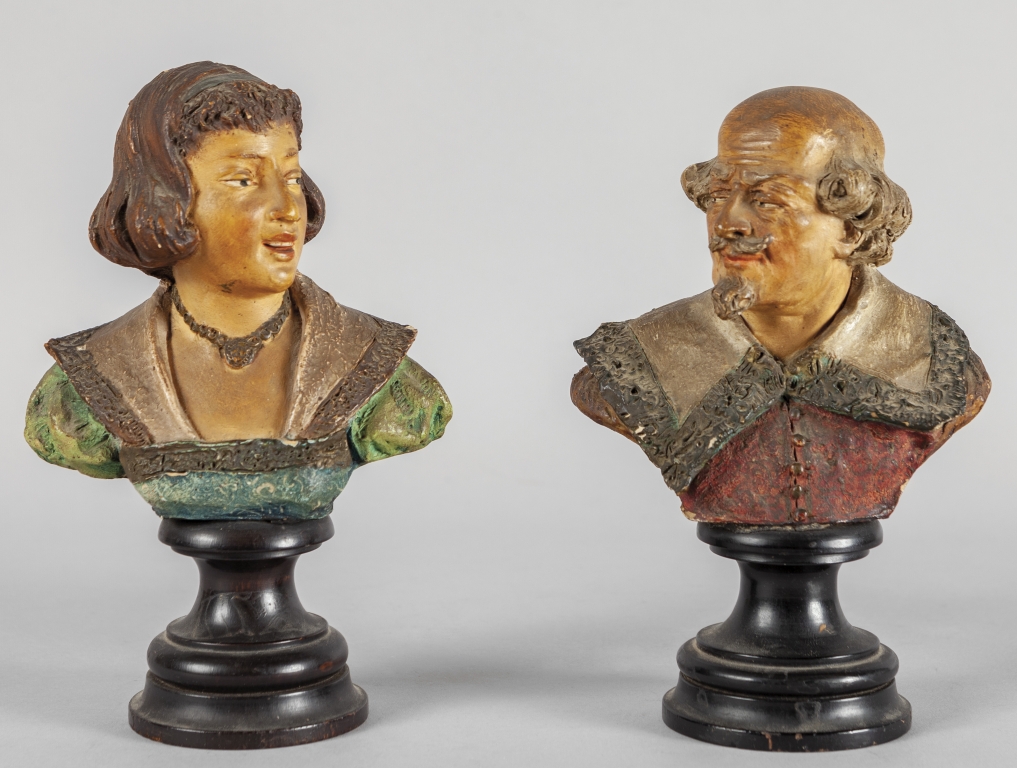 Coppia di mezzibusti in terracotta policroma basi in legno Vienna sec.XIX