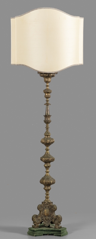 Grande candeliere in rame argentato adattato a lampada