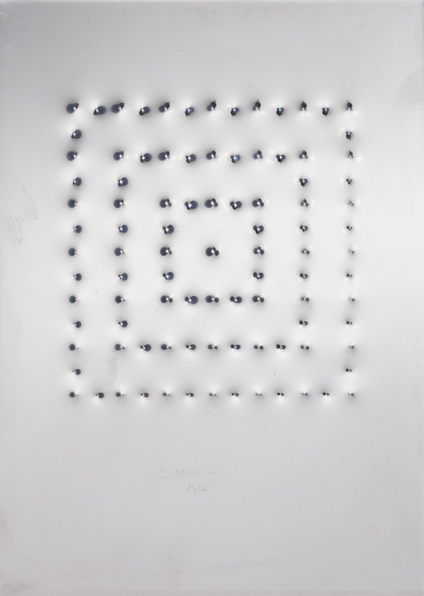 Enrico Castellani Castelmassa (Ro) 1930 - Roma 2017 Senza titolo, 2006 Estroflessione su alluminio, multiplo, es. 21/45, cm. 31x23,4 Firma e tiratura in basso al centro: Castellani / 21/45. L'opera è accompagnata dal volume Vola alta, parola, vent'anni di Edizioni Colophon, catalogo della mostra, Firenze, Biblioteca Nazionale, 28 marzo - 19 aprile 2008. In custodia originale