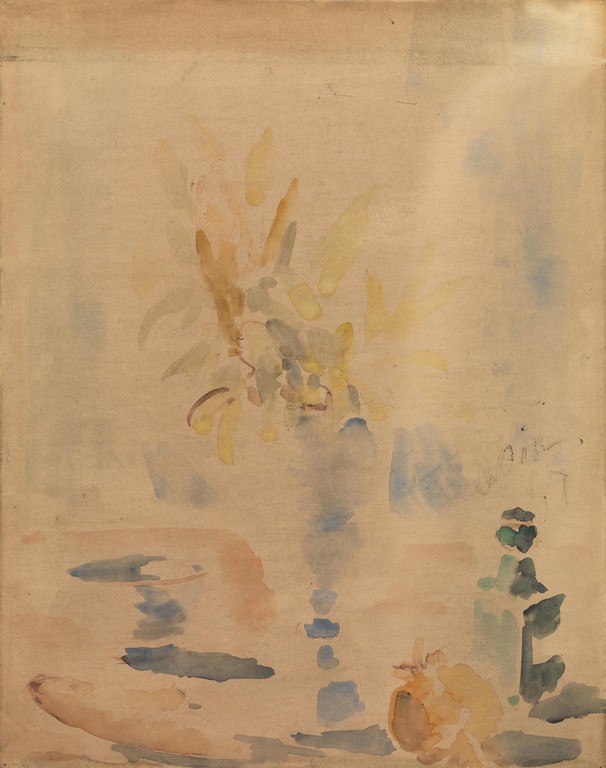 Filippo de Pisis (Ferrara 1896 - Milano 1956) FIORI NEL VASO CON CIOTOLA E CALAMAIO acquerello su carta applicata su tela, cm 44x35 firmato e datato eseguito nel 1947 L'opera è registrata con il numero d'archivio 04037 presso l'Associazione per il patrocinio e lo studio della figura e dell'opera di Filippo de Pisis