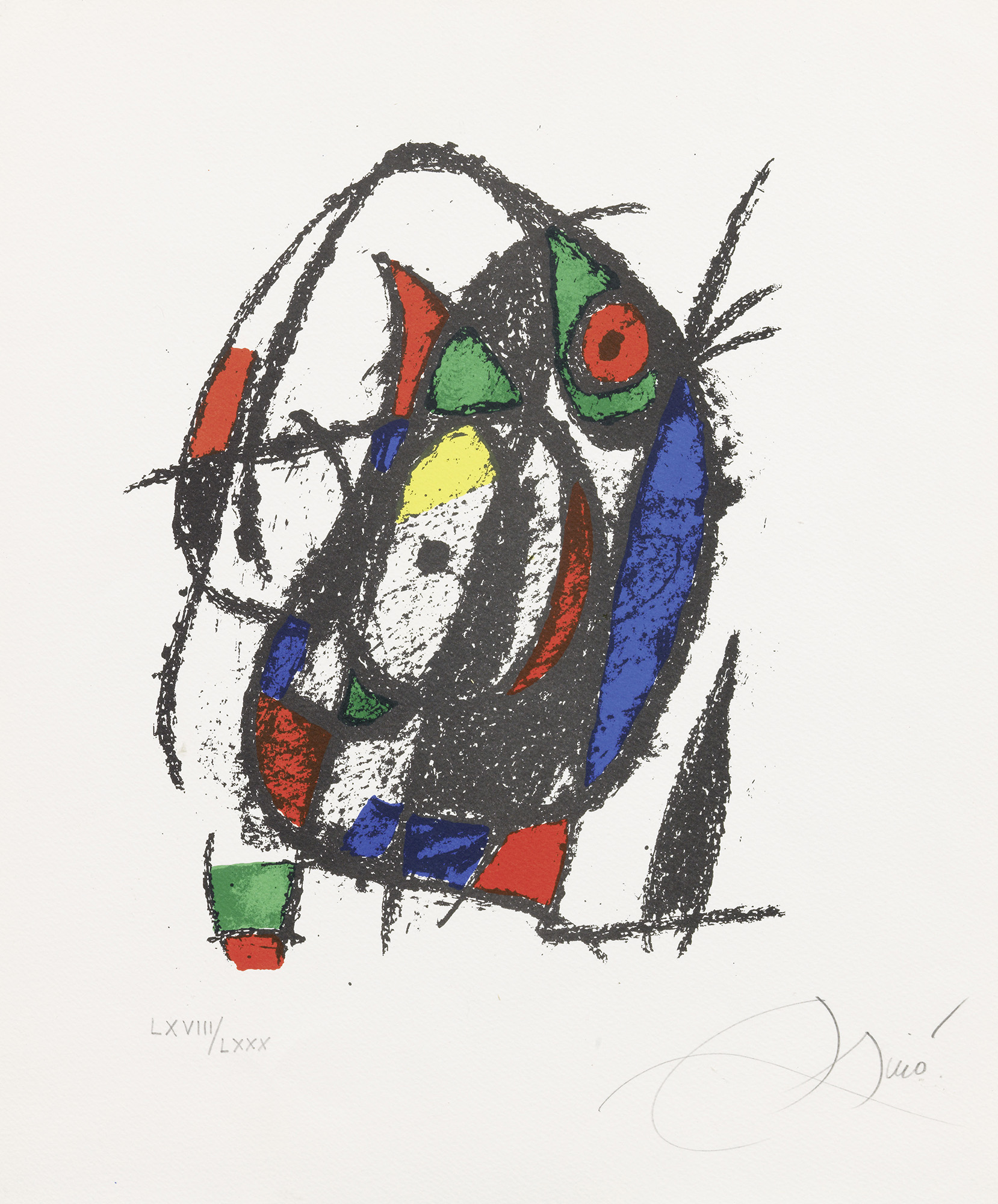 Joan Miró Barcellona 1893 - Palma di Maiorca 1983 Joan Miró litografo II, 1975 Litografia a colori, es. LXVIII/LXXX, cm. 44,3x36,8 Firma a matita sul margine in basso a destra: Miró, tiratura in basso a sinistra: LXVIII/LXXX. Realizzata per il volume Joan Miró litógrafo II, testo di Raymond Queneau, tiratura di 80 esemplari in numeri romani, stampatore Mourlot, Parigi. Bibliografia: Patrick Cramer, Joan Miró Litografo, V. 1972-1975, Maeght Éditeur, Paris, 1992, pp. 145, 151. n. 1040, a colori