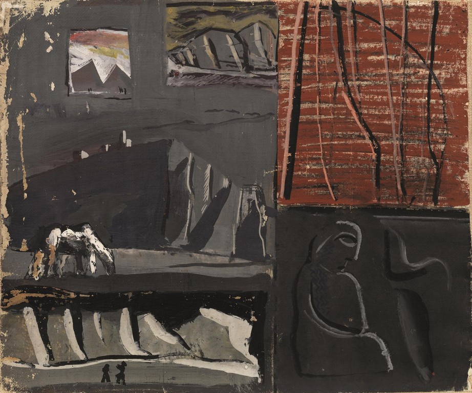 Mario Sironi (Sassari 1885 - Milano 1961) COMPOSIZIONE tempera su carta intelata, cm 32x38 firmato eseguito intorno alla metà degli anni Quaranta L'opera è accompagnata da autentica su fotografia di Francesco Meloni