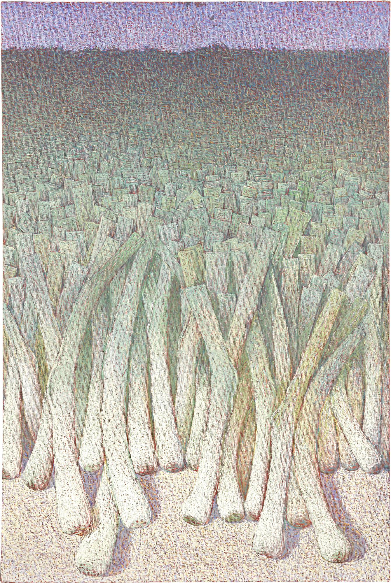 Fabio Aguzzi Milano 1953 Porri, 1992 Olio su tela, cm. 120x79,5 Firma al verso sulla tela: Fabio Aguzzi. Foto autenticata dall'artista su certificato Contini Galleria d'Arte, con n. 0061/FA
