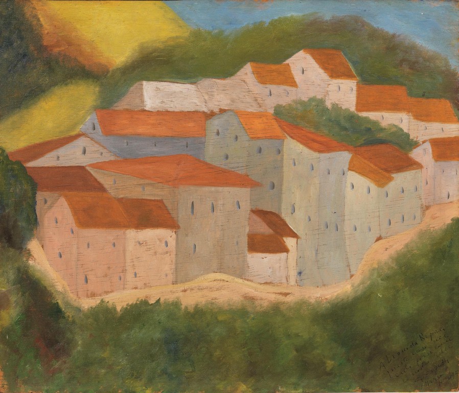 Giuseppe Cesetti (Tuscania 1902 - 1990) PAESAGGIO olio su tavola, cm 37,5x44,5 firmato e dedicato ad personam