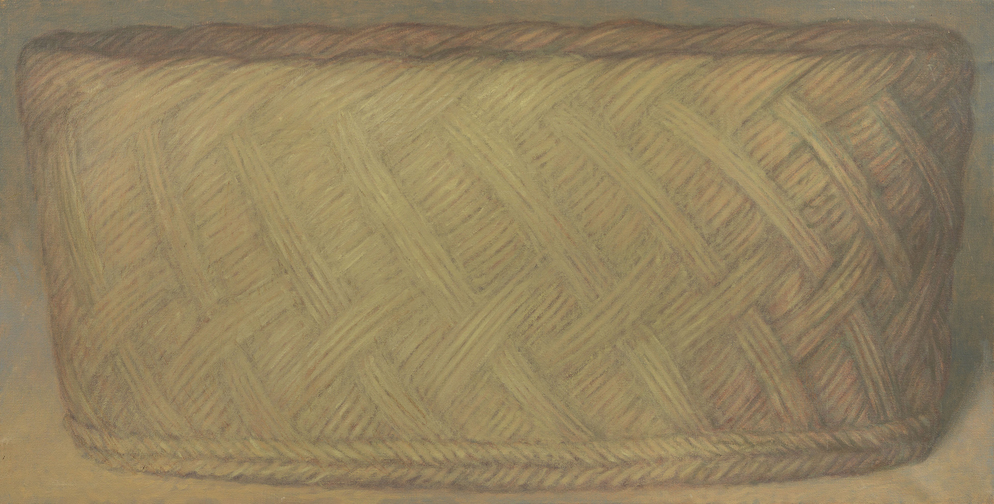 Fabio Aguzzi Milano 1953 Cesto lombardo, 1992 Olio su tela, cm. 55x110 Titolo e firma al verso sulla tela: Cesto lombardo / Fabio Aguzzi; sul telaio: etichetta con indicazione Mostra / Aguzzi Saragno (Macerata) / Pubblicato a pag. 92. Foto autenticata dall'artista su certificato Contini Galleria d'Arte, con n. 240-Q
