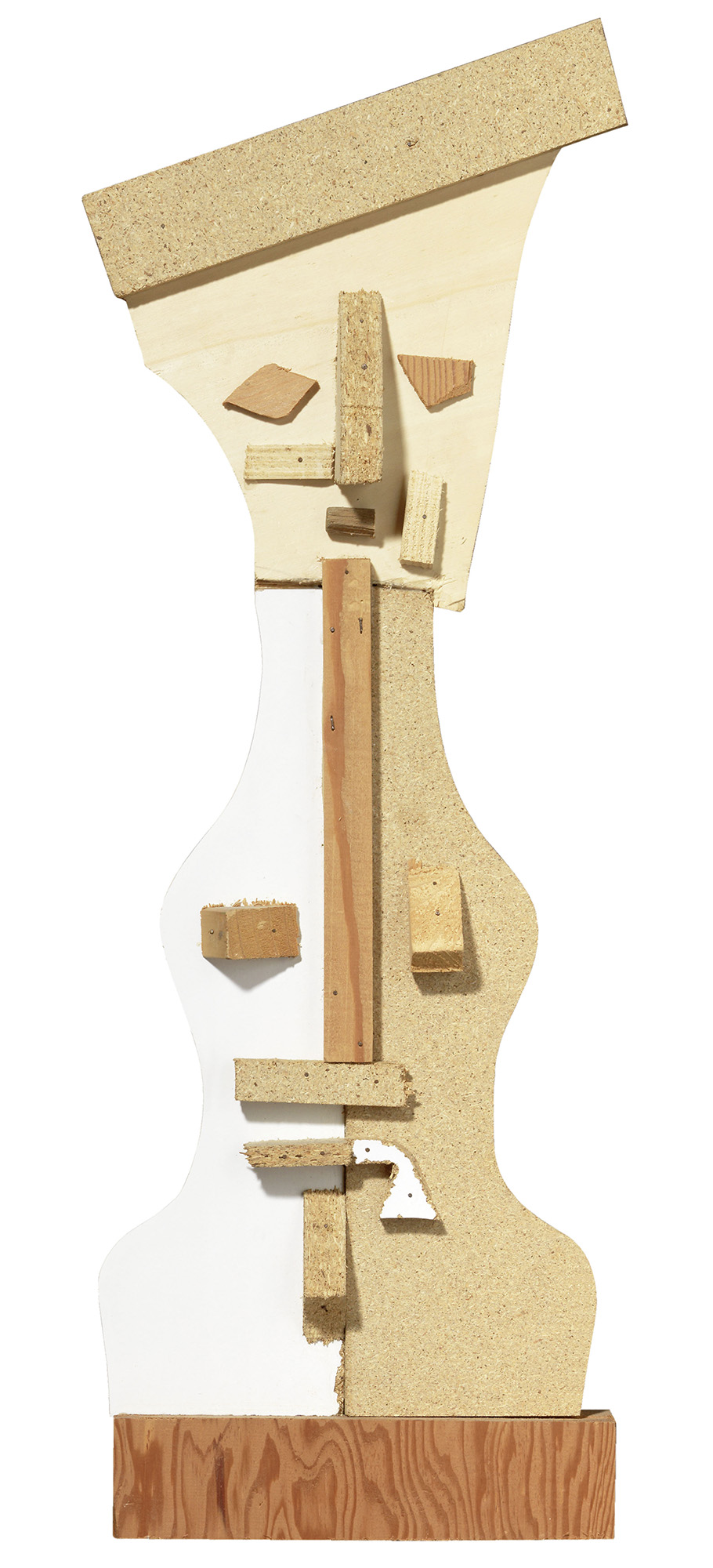 Andrea ed Enrico Baj Milano 1924 - Vergiate (Va) 2003 / Milano 1968 Schiava greca, 1987-88 Assemblaggio di legni, cm. 84x28x8 Firma al verso: Baj; sulla cornice: timbro Galleria Pace, Milano. Foto autenticata dall'artista con timbro "Opera unica originale dal ciclo dell'Iliade di Andrea ed Enrico Baj", e dati dell'opera