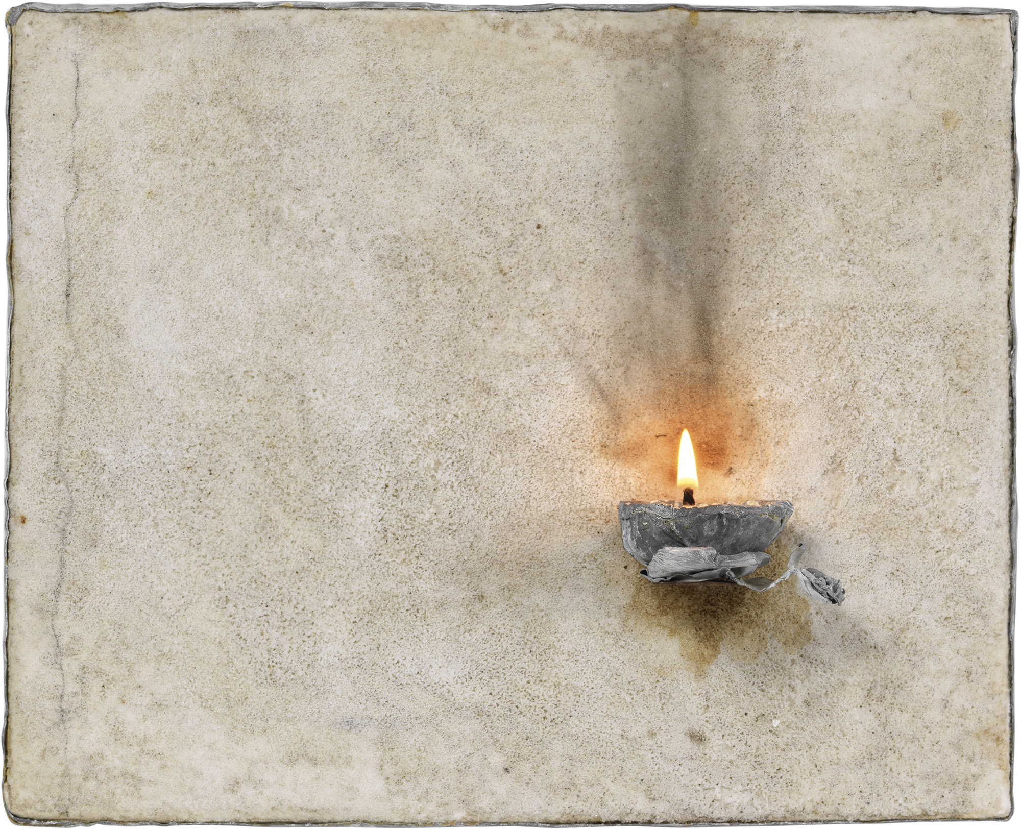 Pier Paolo Calzolari Bologna 1943 Studio, 1979 Sale, grafite, piombo, ferro e lumino a olio su tavola, cm. 21,5x26,5x6 Firma al verso: Calzolari. Foto autenticata dall'artista; certificato su foto Fondazione Calzolari, con n. A-CAL-1979-67