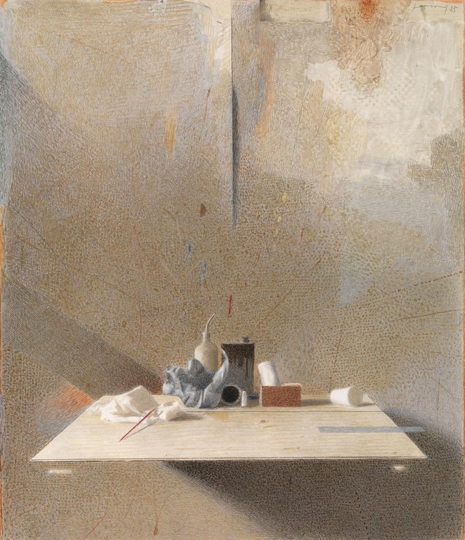 Gianfranco Ferroni (Livorno 1927 - 2001) NATURA MORTA CON CARTOCCIO AZZURRO olio su cartone, cm 35x29,5 firmato e datato eseguito nel 1985