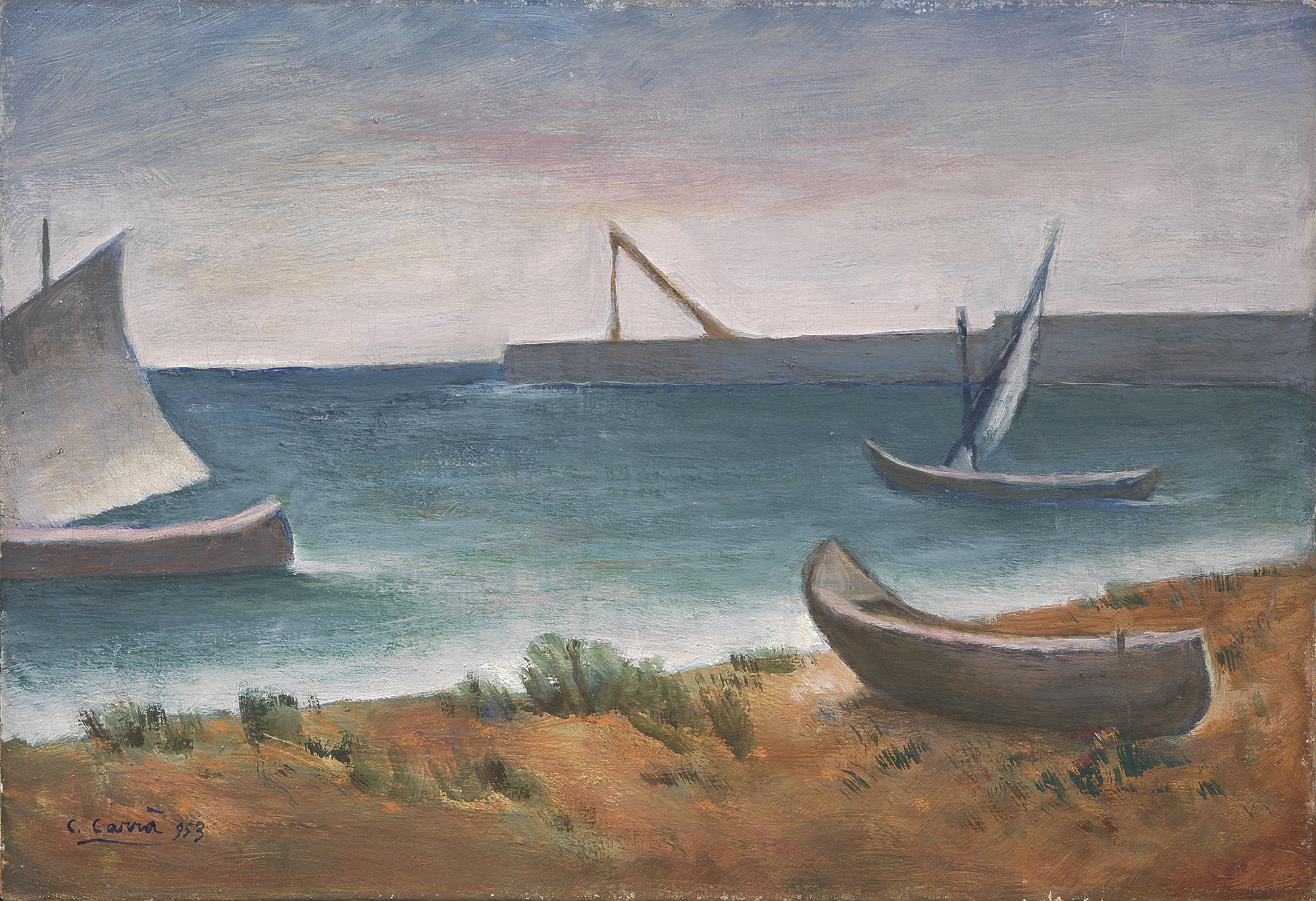 Carlo Carrà Quargnento (Al) 1881 - Milano 1966 Marina, 1953 Olio su tela, cm. 52x76,5 Firma e data in basso a sinistra: C. Carrà 953. Al verso sulla tela: etichetta con n. 119 e quattro timbri Raccolta Lizzola, Milano. Storia Collezione privata, Milano; Collezione privata Certificato su foto di Massimo Carrà, in data 21/3/93. Bibliografia Massimo Carrà, Carrà, tutta l'opera pittorica volume III, 1951-1966, L'Annunciata / La Conchiglia, Milano, 1968, pp. 115, 573, n. 27/53.