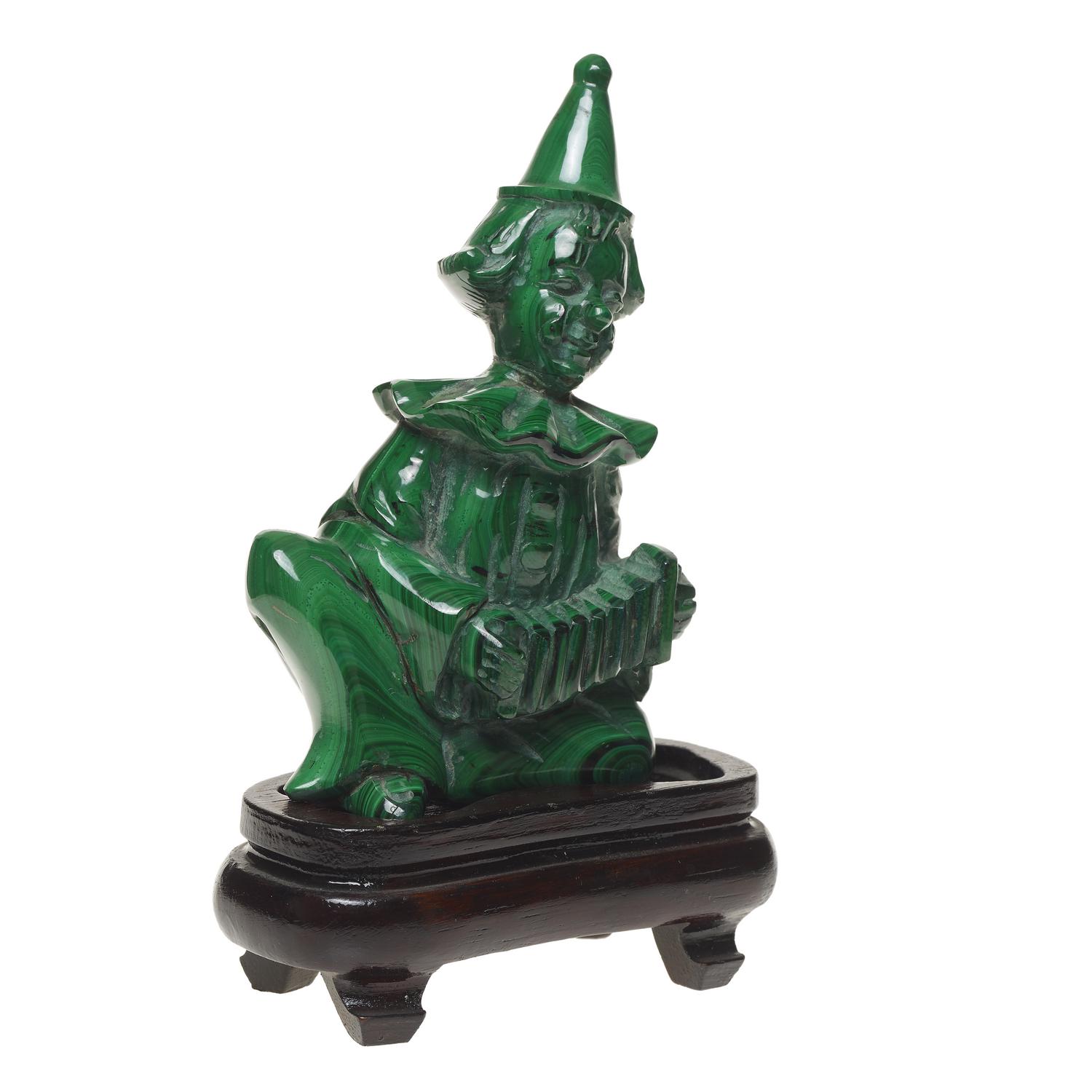 SCULTURA IN MALACHITE, XX SECOLO raffigurante un clown cm 12x8, base in legno...