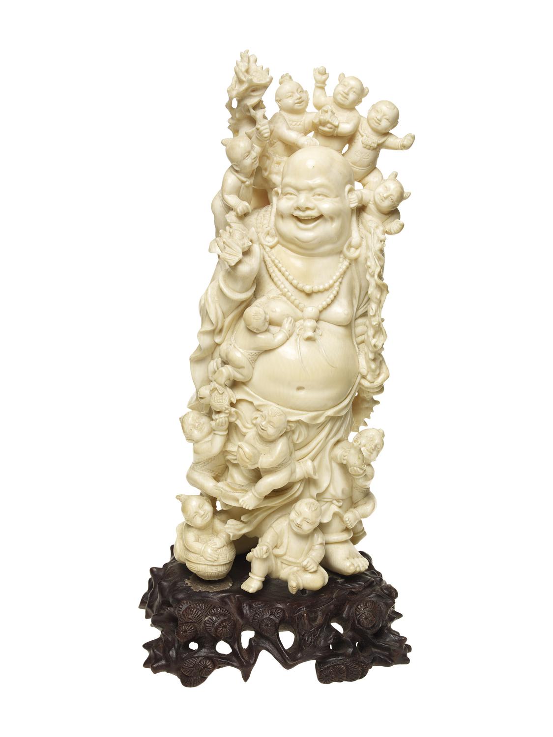 raffigurante un Buddha con ampio ventre, Pu-Tai intorno al collo e circondato da bambini festanti cm 25,5x11, base in legno cm 4x13,5, g 1282,6