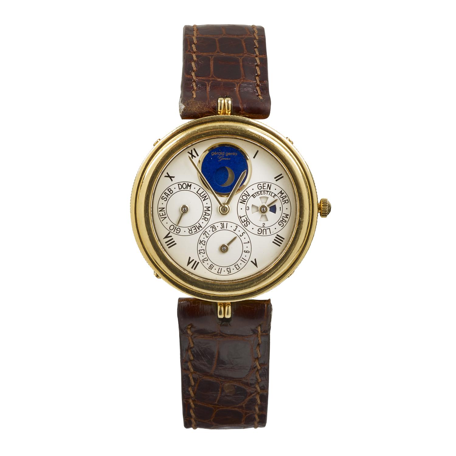 orologio da polso, automatico, in oro giallo 18 k, con calendario perpetuo e fasi lunari, fibbia ad ardiglione in oro 18 k Gerald Genta, corredato di garanzia entro astuccio in pelle ed accessorio originale in oro per la regolazione delle funzioni
