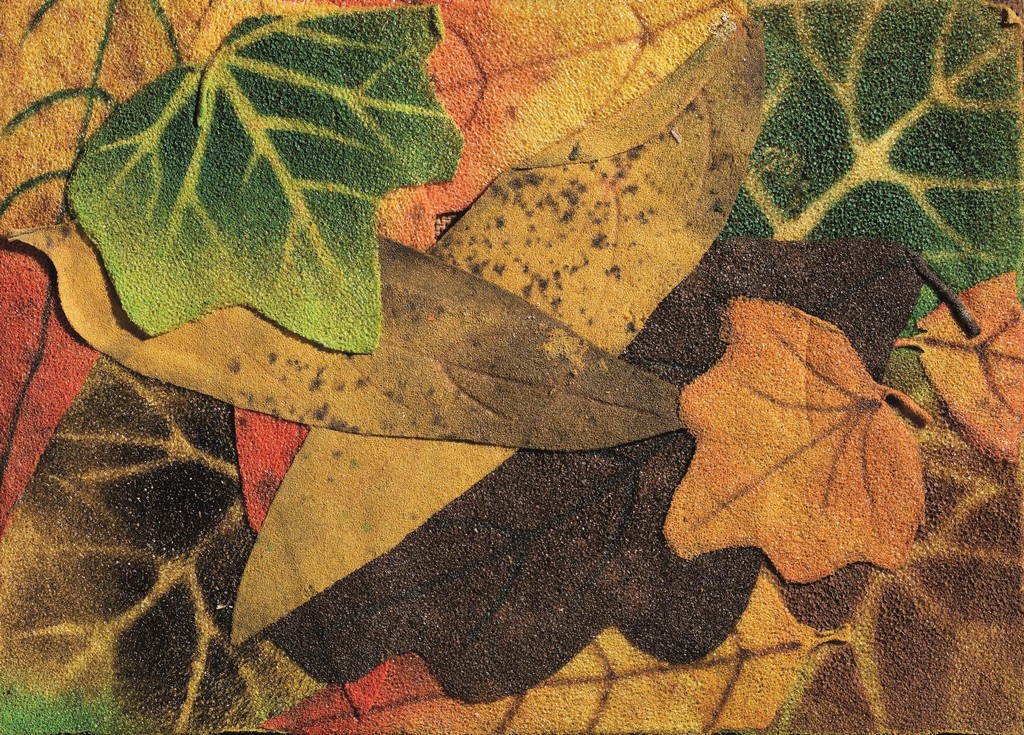 Piero Gilardi (Torino 1942) FOGLIE CADUTE multiplo in poliuretano espanso sagomato e colorato a mano, applicato su tavoletta, cm 14,5x20,5; es. 65/120 sul retro: firmato e datato eseguito nel 1976