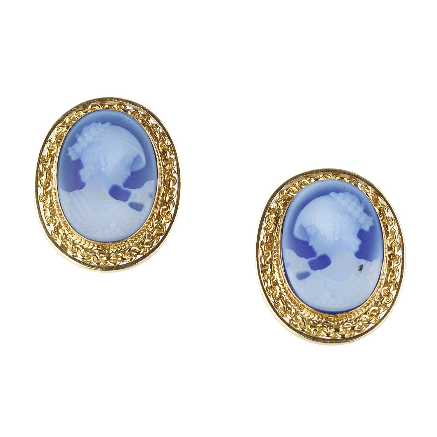 ciascuno realizzato con un cammeo ovale in calcedonio blu raffigurante profilo muliebre a mezzo busto entro montatura in oro cesellato, punzone 750, dim cm 2,4x1,9, g 14