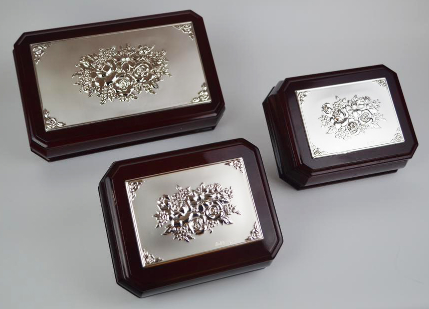 PORTAGIOIE IN LEGNO E ARGENTO tre scrigni in legno decorati da lamine in...