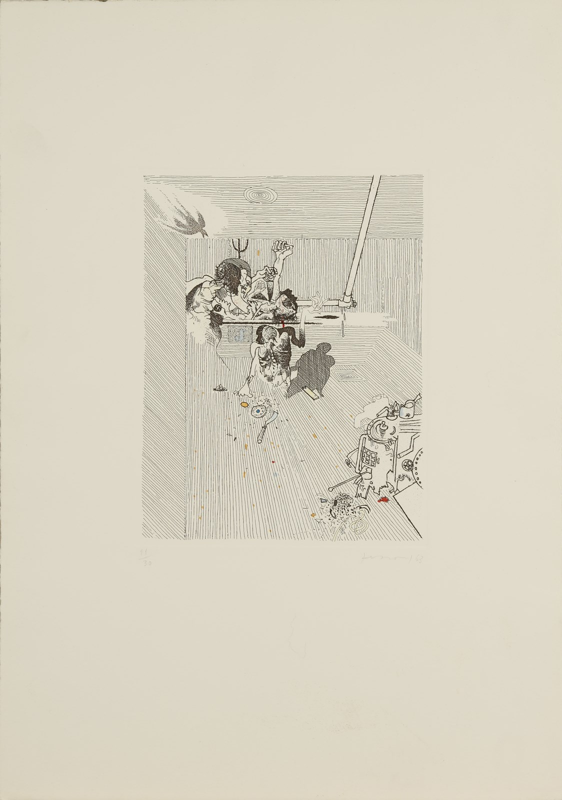 FERRONI GIANFRANCO (1927 - 2001) Senza titolo. 1963. Acquaforte. Cm 35,00 x 50,00. 11/30. Tiratura, firma e anno a matita in basso. Dimensione lastra: 23.5x18 cm.