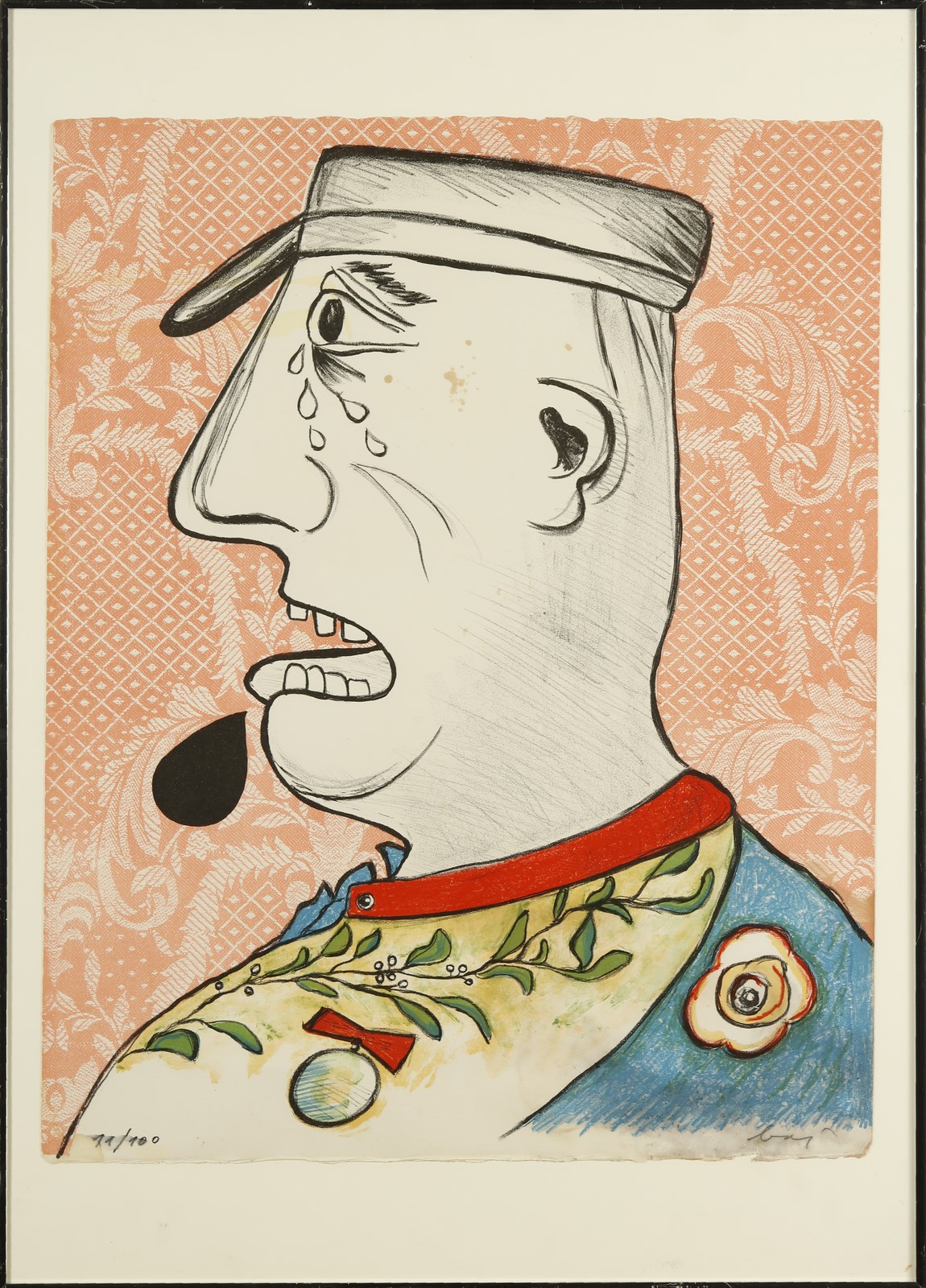 BAJ ENRICO (1924 - 2003) Le Grand Charles. 1965. Litografia. Cm 45,00 x 56,00. 11/100. Tiratura e firma in basso a matita. Lievi difetti. Dalla cartella “Larmes de Généraux”. Igell Edizioni, Stoccolma. Bibliografia: Petit 108 (1); Bay, Catalogo generale delle stampe originali, Electa, 108. . Cornice presente