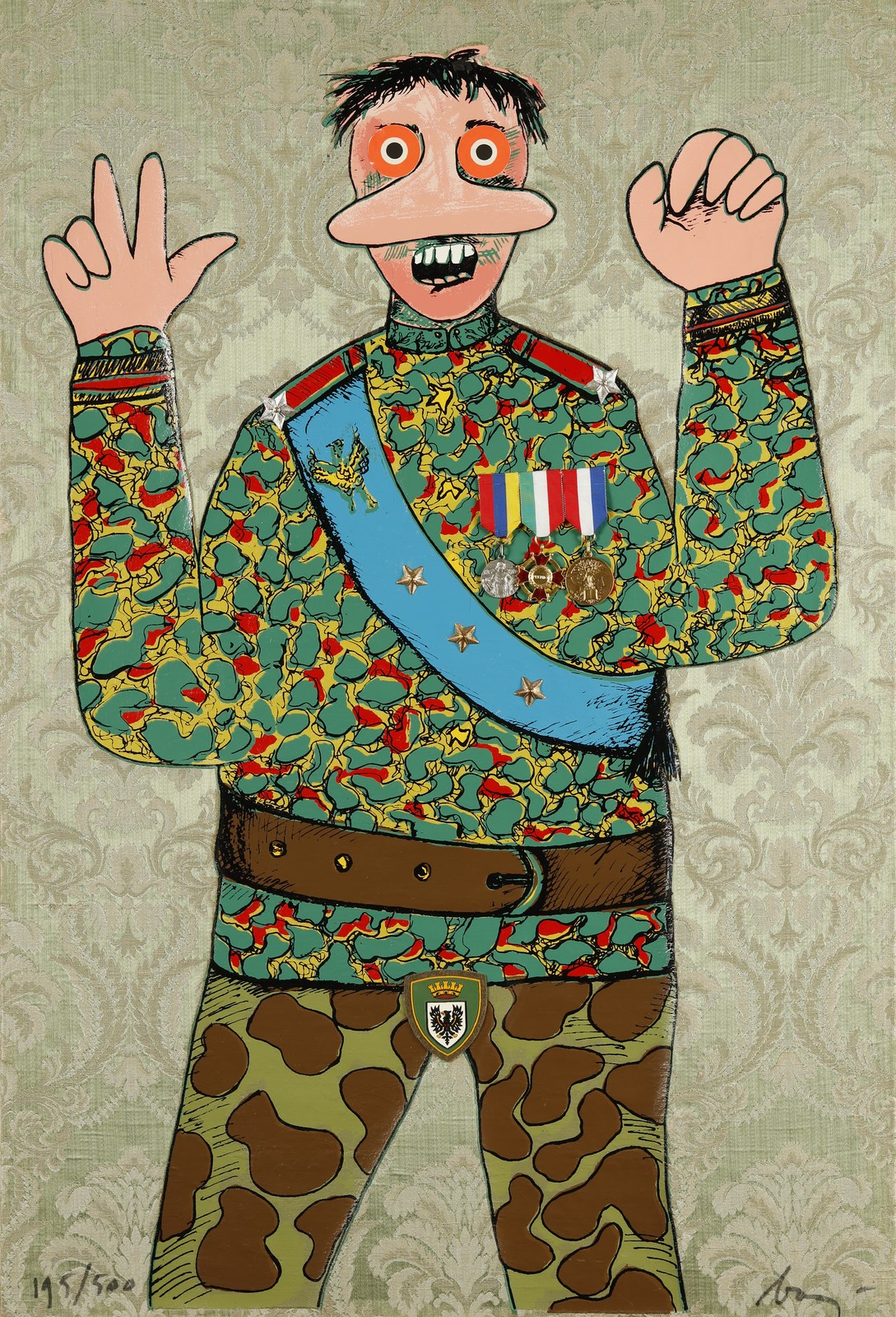 BAJ ENRICO (1924 - 2003) Lo stratega del doppio gioco. 1971. Serigrafia, floccaggio e collage. Cm 60,00 x 90,00. 195/500. Tiratura e firma a matita in basso. Bibliografia: Petit 28.