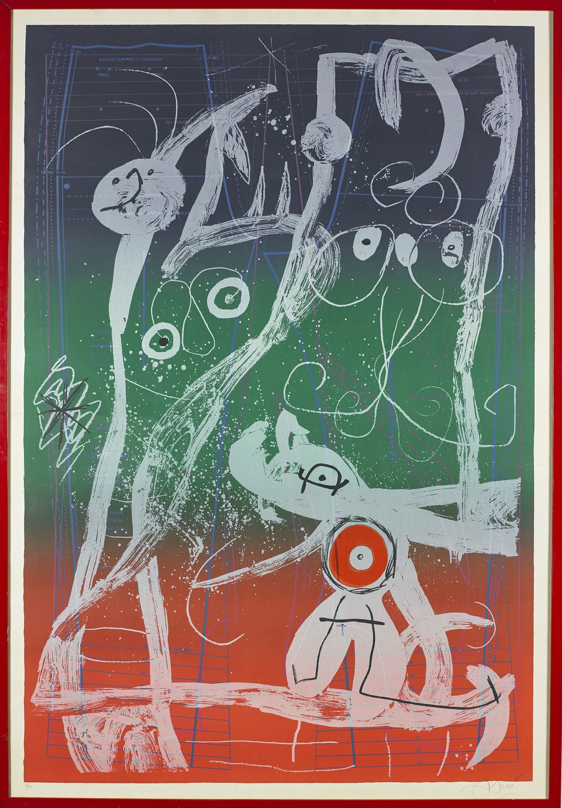 MIRO' JOAN (1893 - 1983) Le delire du coutrier-bleu, rouge, vert. 1969. Litografia a colori. Cm 86,00 x 128,00. 3/30. Tiratura e firma a matita in basso. Editore: Maeght Editore, Parigi. Pubblicazione: Joan Mirò Litographe, vol. IV, Maeght Editore, n. 645; Catalogo d'asta Una importante coleccion de Obra Grafica y libros ilustrados de Joan Miro', II sessione, 22 Febbraio 1989, lotto 158.