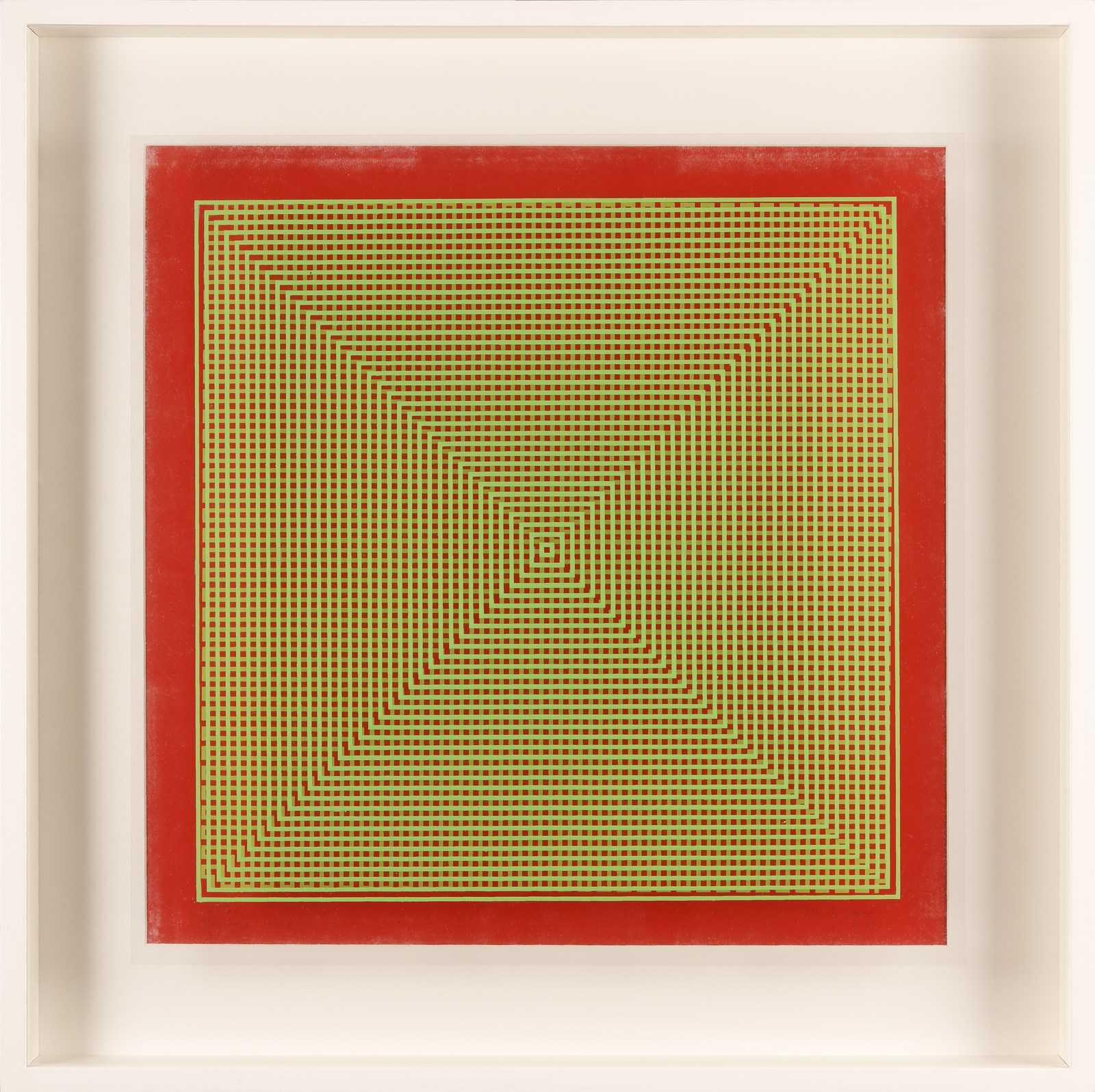 BIASI ALBERTO (n. 1937) Progetto S1, dinamica visiva in verde su fondo rosso. 1970. Doppia serigrafia su pvc trasparente e cartoncino.. Cm 47,50 x 47,50. 22/100. Tiratura, titolo, firma e anno a matita in basso. Giuseppe Strano Editore, Padova. . Cornice presente