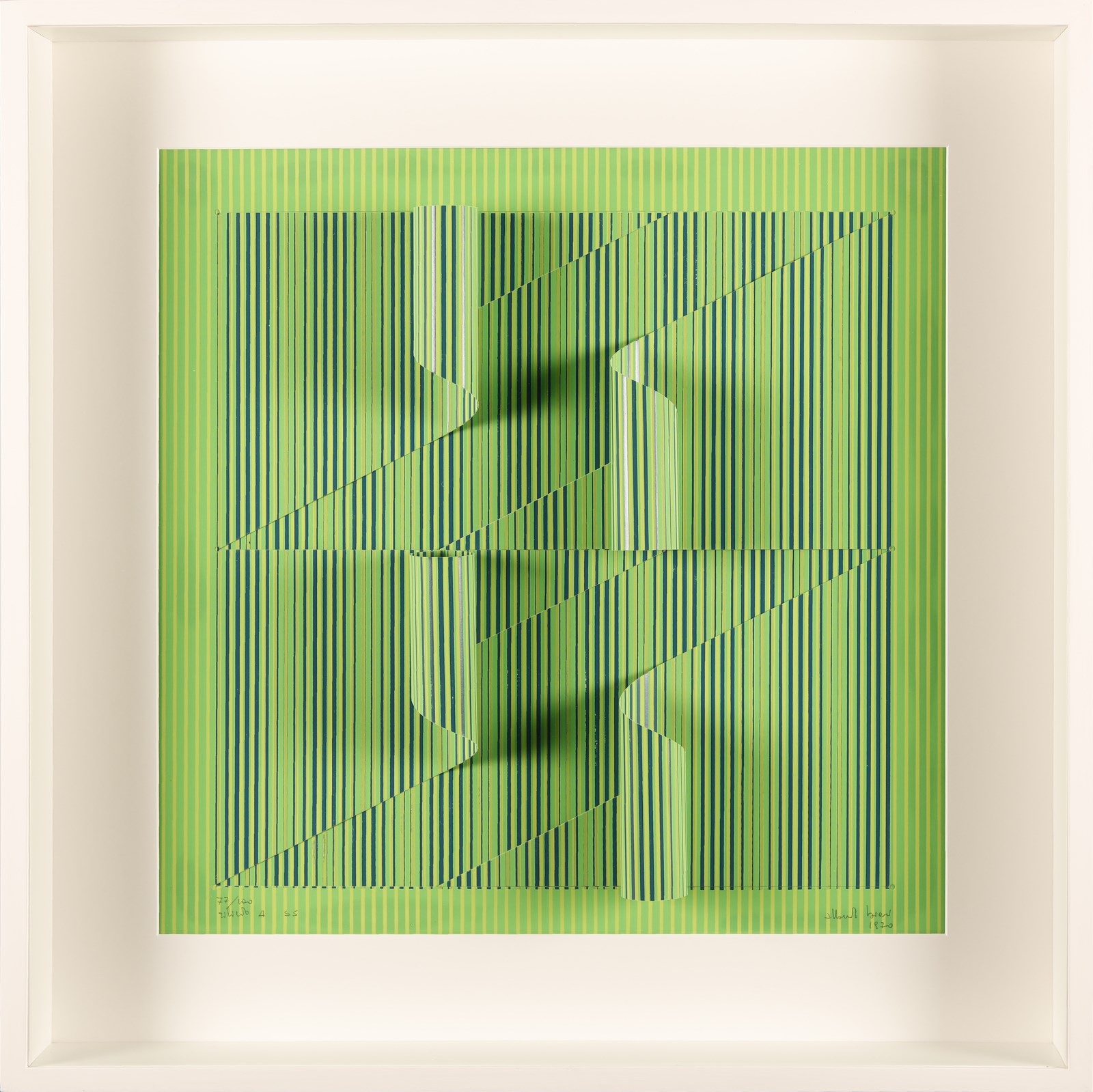 BIASI ALBERTO (n. 1937) Progetto S5, rilievo 4 in blu e giallo su fondo verde. 1970. Doppia serigrafia su cartoncino mat. Cm 47,50 x 47,50. 77/100. Tiratura, titolo, firma e anno a matita in basso. Cartoncino superiore fustellato a zig zag con tagli corti verticali per l'incastro. Giuseppe Strano Editore, Padova. . Cornice presente