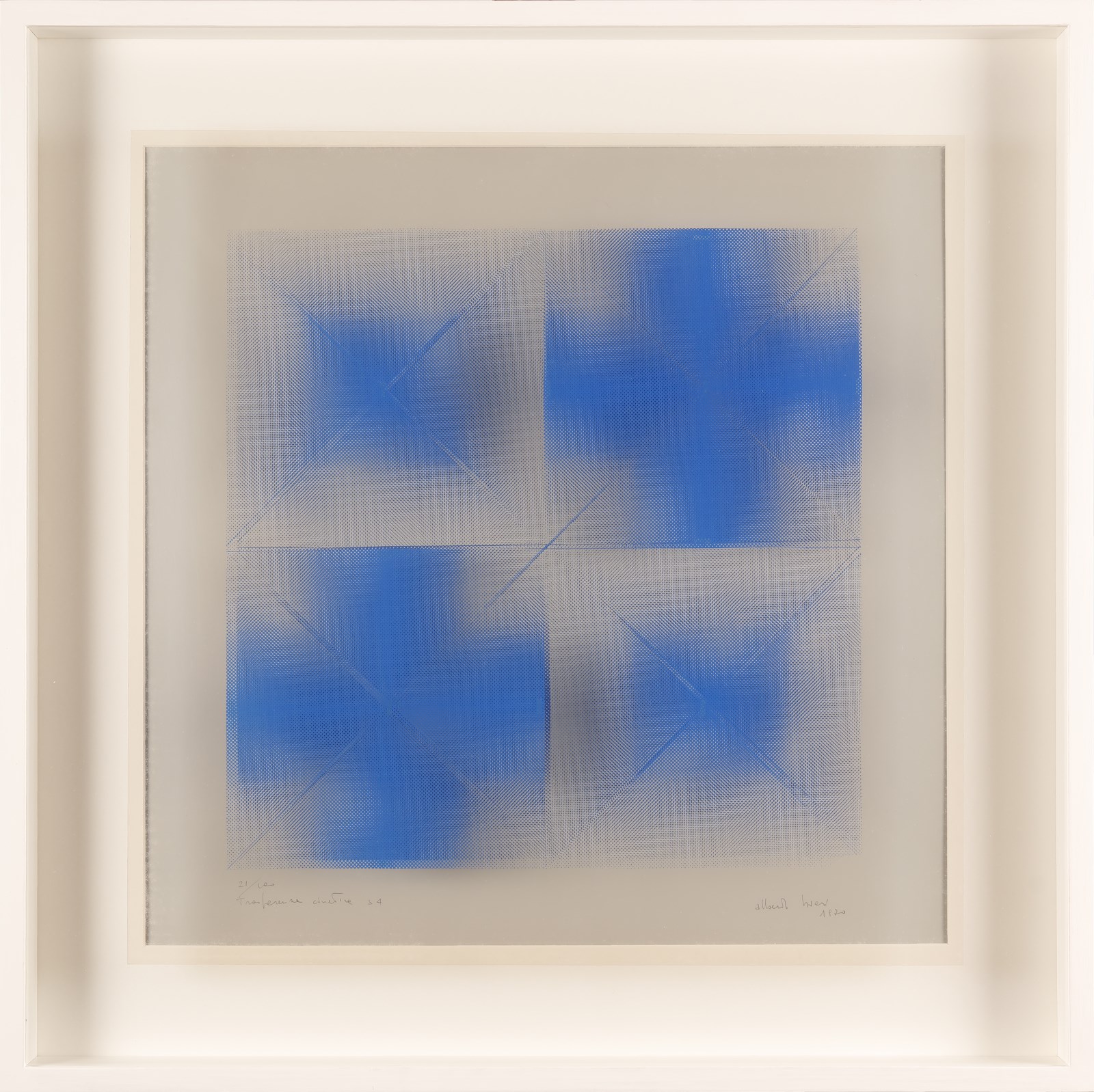 BIASI ALBERTO (n. 1937) Progetto S4, trasparenza cinetica in blu su fondo grigio chiaro. 1970. Doppia serigrafia su pvc trasparente e cartoncino.. Cm 47,50 x 47,50. 21/100. Tiratura, titolo, firma e anno a matita in basso. Giuseppe Strano Editore, Padova. . Cornice presente