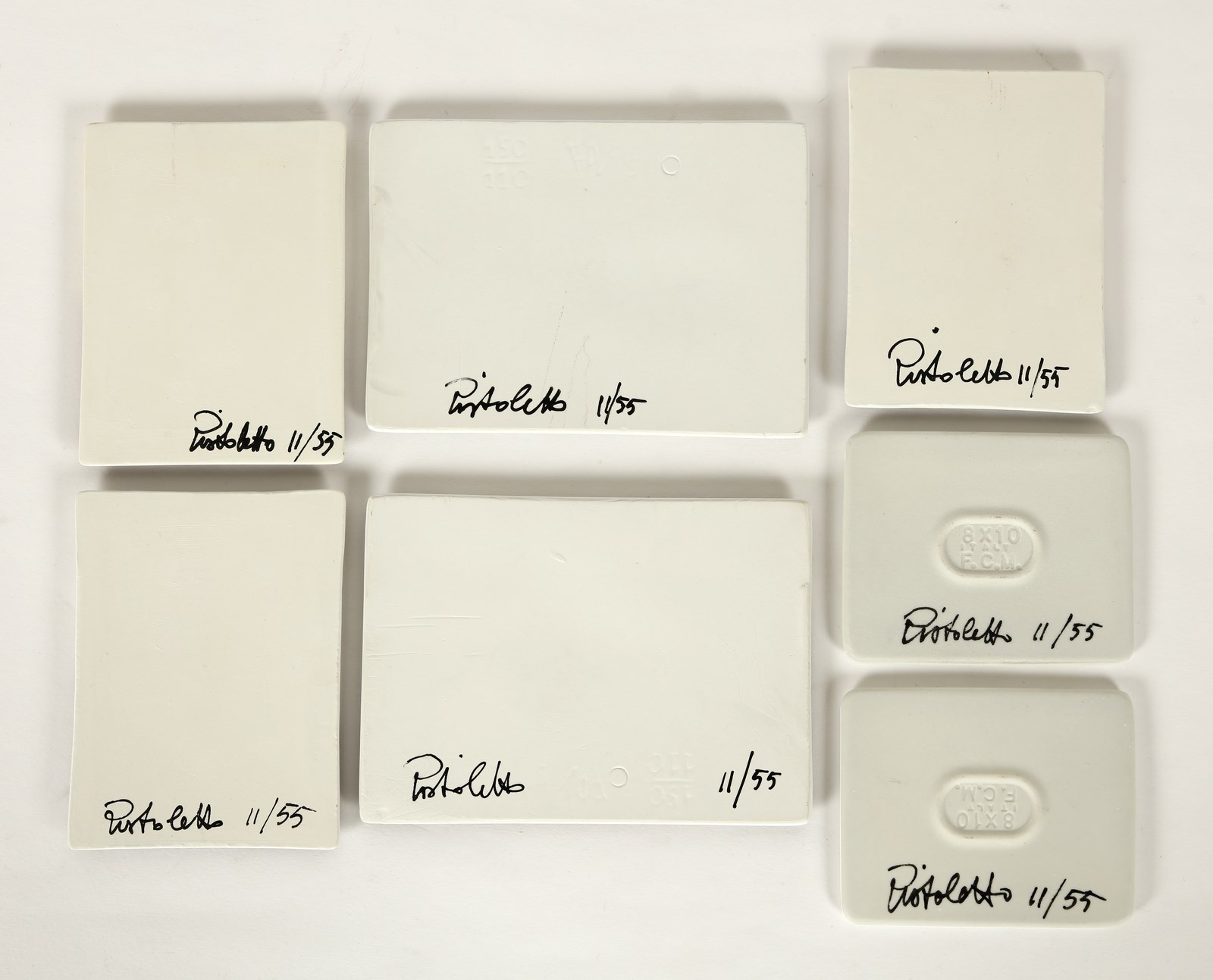 PISTOLETTO MICHELANGELO (n. 1933) Lotto composto da n.7 dagherrotipi. Oggetti in meno - souvenir. . 1997. Dagherrotipo su ceramica.. Cm 10,00 x 8,00 x 11,00. 11/55. Ogni dagherrotipo è firmato e numerato al retro. Documenta X Editions Schellmann Munchen - New York. Scatola originale.