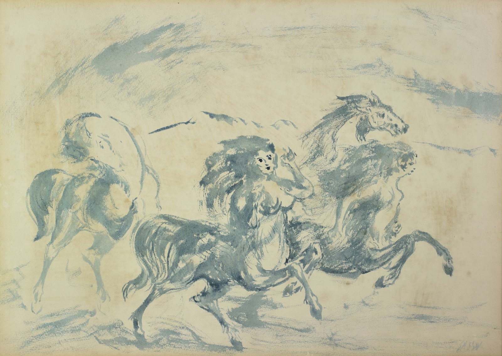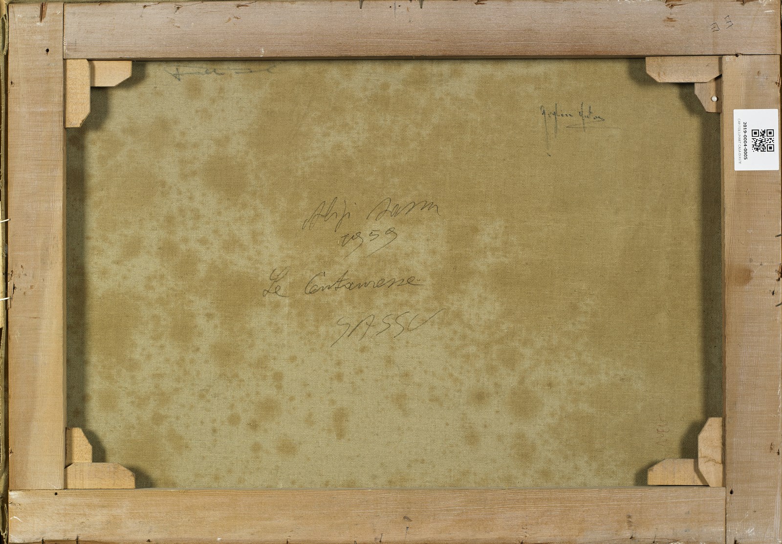 SASSU ALIGI (1912 - 2000) Senza titolo. 1959. Tecnica mista su carta applicata su tela . Cm 60,00 x 40,00. Firma in basso a destra. Al retro titolo, firma e anno. Opera archiviata presso l'Archivio Aligi Sassu, Carate Brianza come da documentazione fotografica allegata all'opera riportante il relativo numero d'inventario.